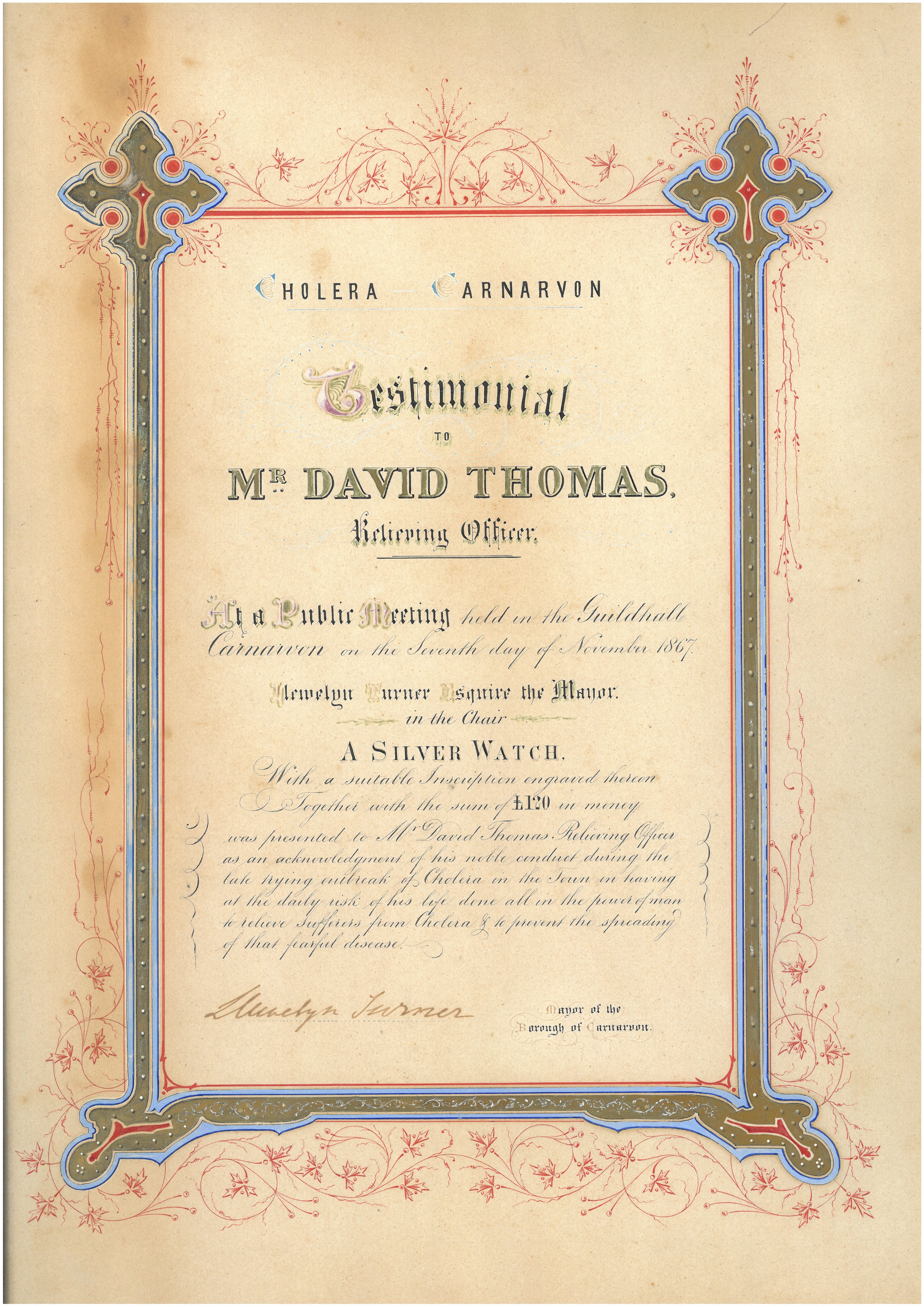 Tystysgrif ynglŷn a chyflwyniad oriawr arian a £120 i David Thomas ‘fel cydnabyddiaeth o’i ymddygiad bonheddig yn ystod y cyfnod anodd a heriol pan fu achosion o Golera yn y dref, drwy beryglu ei fywyd yn ddyddiol er mwyn gwneud popeth sydd o fewn gallu dyn i leddfu dioddefaint o’r Colera ac i rwystro’r afiechyd ofnadwy rhag lledaenu’.