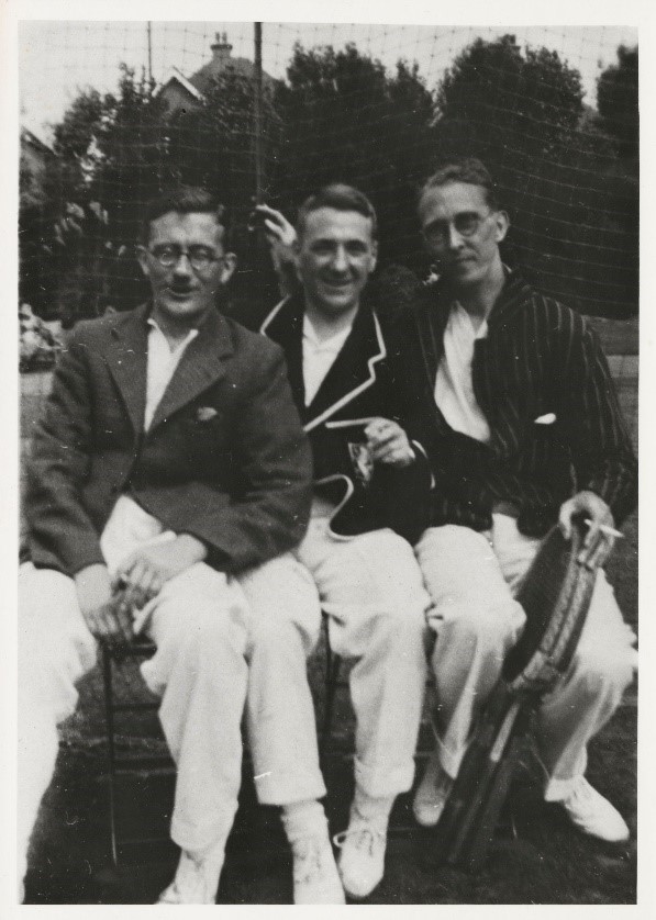 Ffotograff du a gwyn o dynion a menywod yn eistedd i'r gamera gyda'i racedi tenis