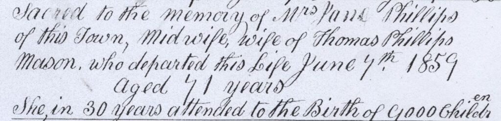 Er cof am Mrs Jane Phillips o’r dref hon, bydwraig, gwraig i Thomas Phillips, saer maen, a fu farw ar 7 Mehefin, 1859, yn 71 oed. Dros gyfnod o 30 mlynedd, helpodd gyda genedigaethau 9,000 o blant.