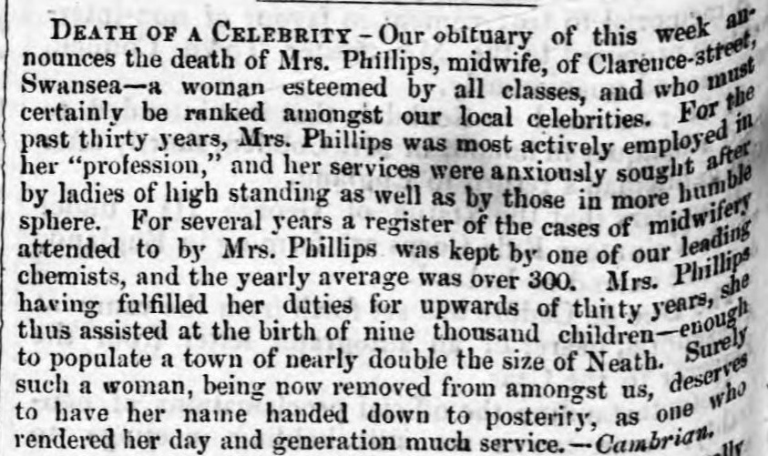 Drwy ymchwilio ymhellach, des i o hyd i ysgrif goffa ar gyfer Jane ym mhapur newydd The Cambrian, dyddiedig 10 Mehefin 1859. Mae’n disgrifio Jane Phillips fel “gwraig a oedd yn uchel ei chlod ymysg yr holl ddosbarthiadau…roedd galw mawr am ei gwasanaethau gan wragedd mawr eu parch yn ogystal â’r rheini yn y cylch mwy diymhongar… roedd Mrs Phillips, a fu’n fydwraig am dros 30 mlynedd, wedi cynorthwyo yng ngenedigaethau naw mil o blant – digon i boblogi tref bron dwbl maint Castell-nedd… Yn sicr mae’r fath wraig yn haeddu i’w henw gael ei draddodi i’r oesoedd i ddod fel un a wnaeth gryn gymwynas â’i chyfnod a’i chenhedlaeth.”