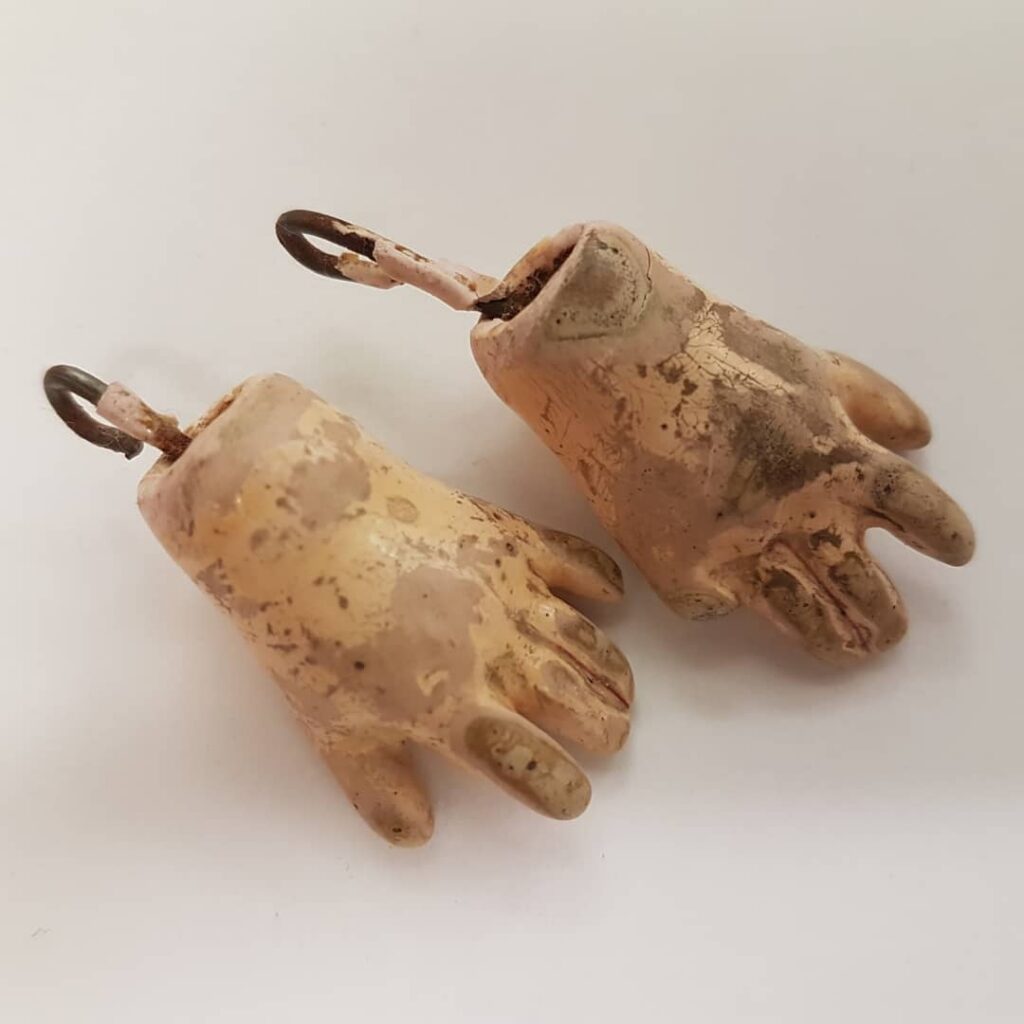 Ar gyfer gwrthrychau corfforol, cofiwch gynnwys unrhyw fanylion pwysig. Fel y gwelwch o ddwylo’r doliau hyn o Archifau a Chasgliadau Arbennig Prifysgol Caerdydd, heb ddisgrifiad cysylltiedig o ryw fath, gallai’r cwestiwn o sut roedd yr eitemau hyn yn rhan o archif (neu hyd yn oed beth yw’r eitem!), barhau i fod yn ddirgelwch.