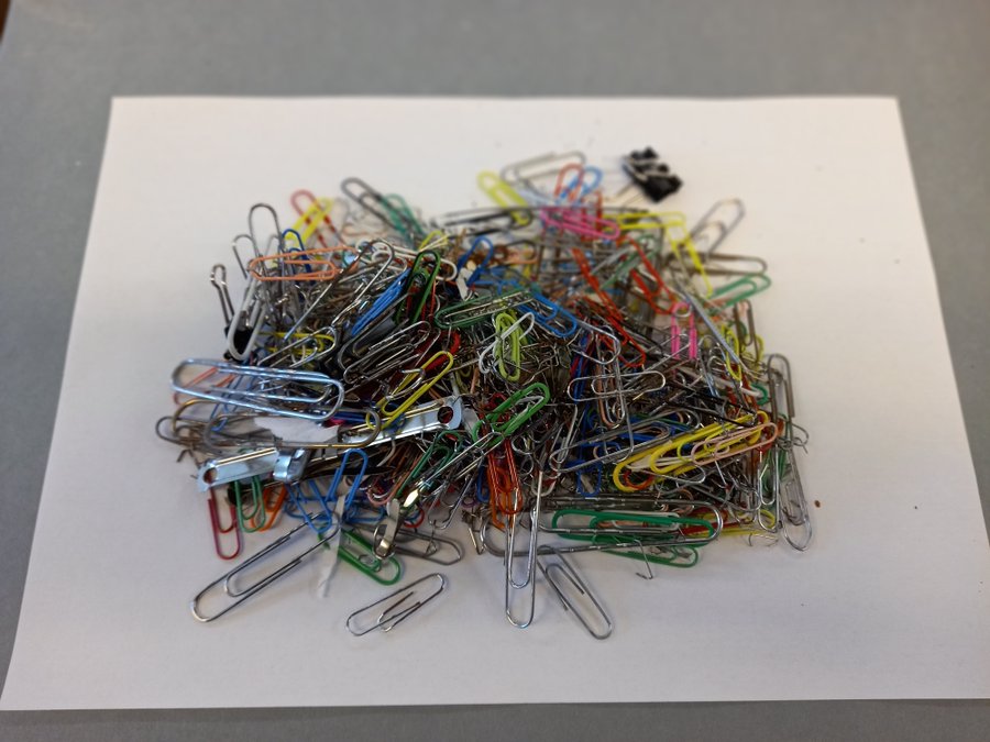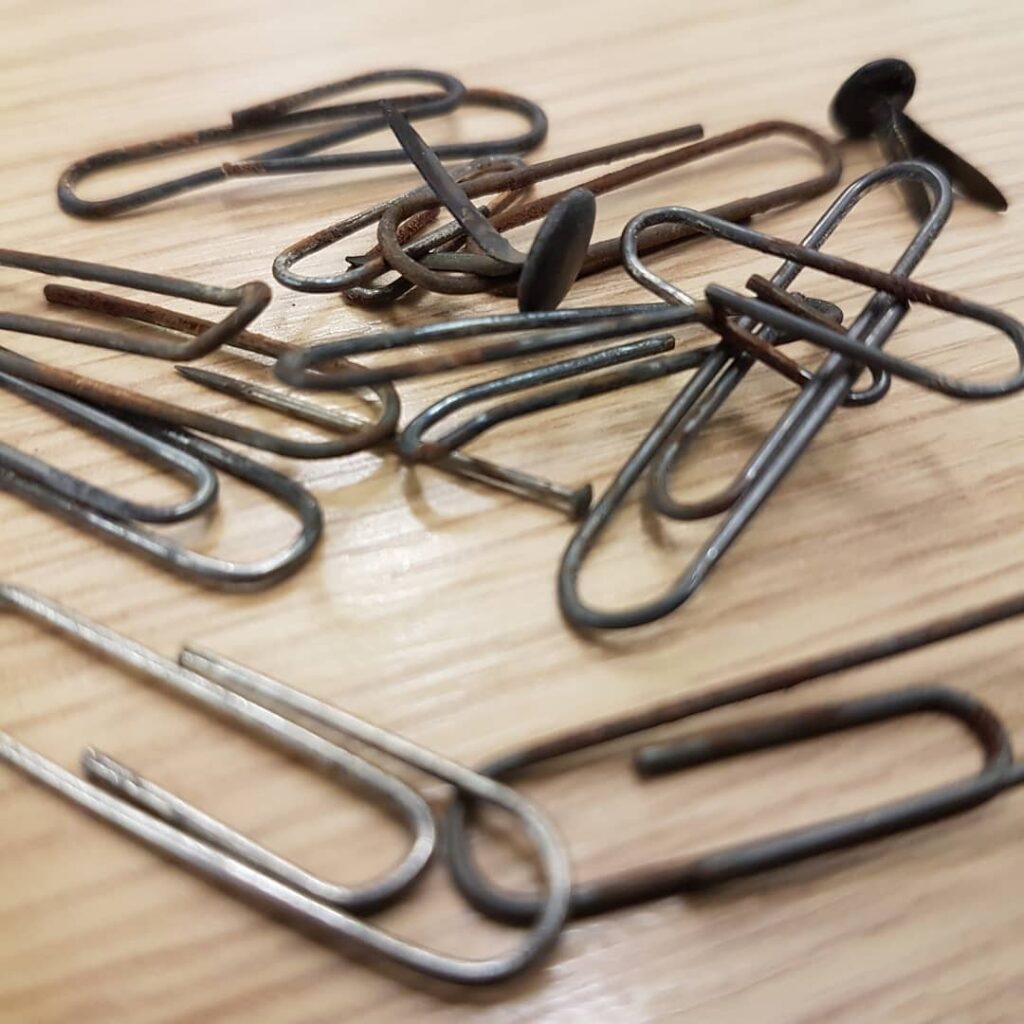 Yn gyntaf, mae’n bryd ffarwelio â chlipiau papur safonol, wrth iddynt rydu a difrodi eitemau dros amser. Dewiswch glipiau papur pres neu ystyriwch ddulliau amgen o gysylltu’r eitemau yn lle. Diolch byth cafodd y clipiau papur hyn eu tynnu allan o gasgliadau yn Llyfrgell Genedlaethol Cymru ac Archifau a Chasgliadau Arbennig Prifysgol Caerdydd cyn iddynt allu rhydu ymhellach.