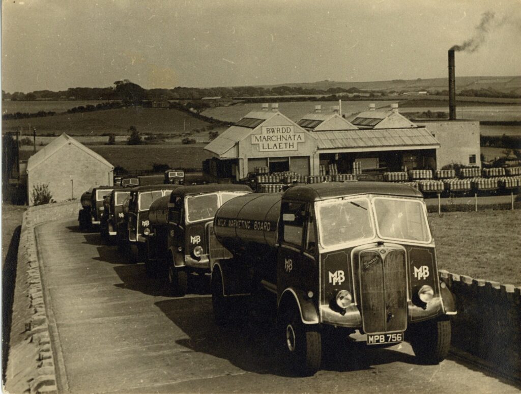 2. Llun: Loriau llaeth tu allan Bwrdd Marchnata Llaeth, Llangefni.