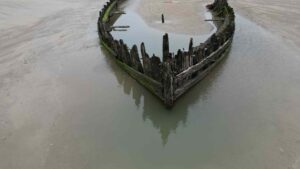 Llongddrylliad Cefn Sidan 2. Golygfa allanol arosgo lefel isel o’r blaen a’r pwll sgwrio cysylltiedig ar 21/02/2923.