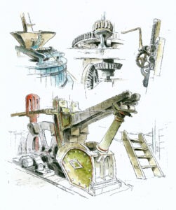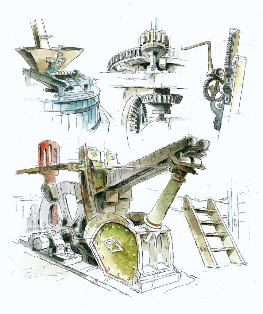 Melin Pannu Moelwyn, Blaenau Ffestiniog; darlun yn dangos y stoc pannu ym Melin Moelwyn a sawl nodwedd sy’n nodweddiadol o felinau eraill, a gynhyrchwyd gan Falcon D. Hildred.