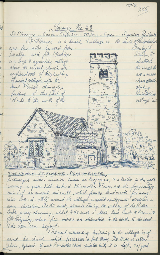 Darlun gan R.E. Kay yn dangos Eglwys Sant Fflorens, Sir Benfro. Fel y’i gwelir ar dudalen 285 o Gyfres I, Cyfrol II o Lyfrau Nodiadau R.E. Kay.
